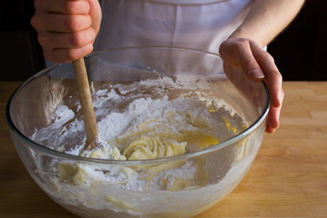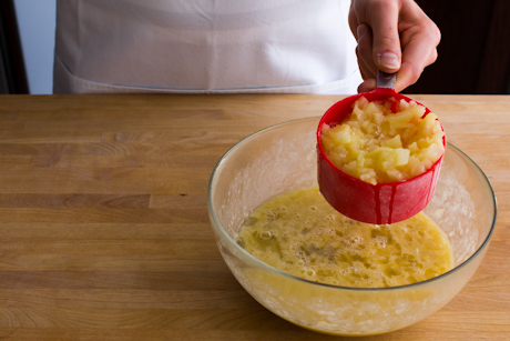 Ajouter les ingrédients liquides au mélange sec et remuer jusqu'à ce que le tout soit bien combiner, en prenant soin de ne pas trop mélanger.