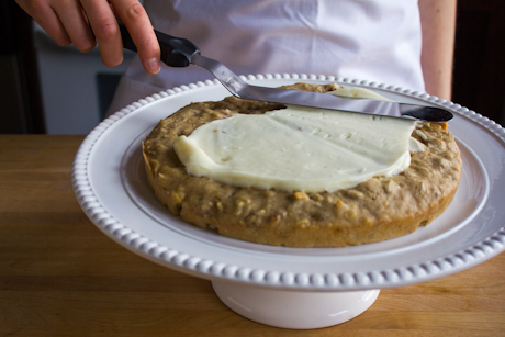 Déposer un gâteau sur un plateau à gâteau ou une assiette et couvrir uniformément de glaçage à l'aide d'un couteau ou d'une spatule à glaçage.